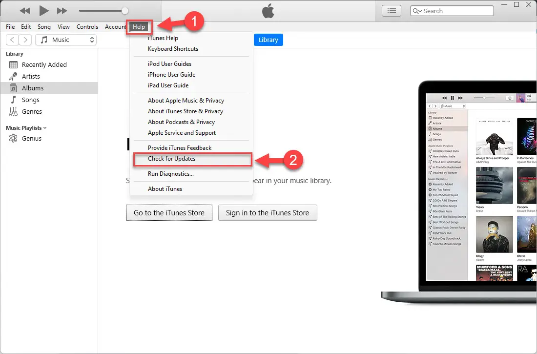 To check for iTunes updates, click Help from the ribbon menu, and then click Check for updates.