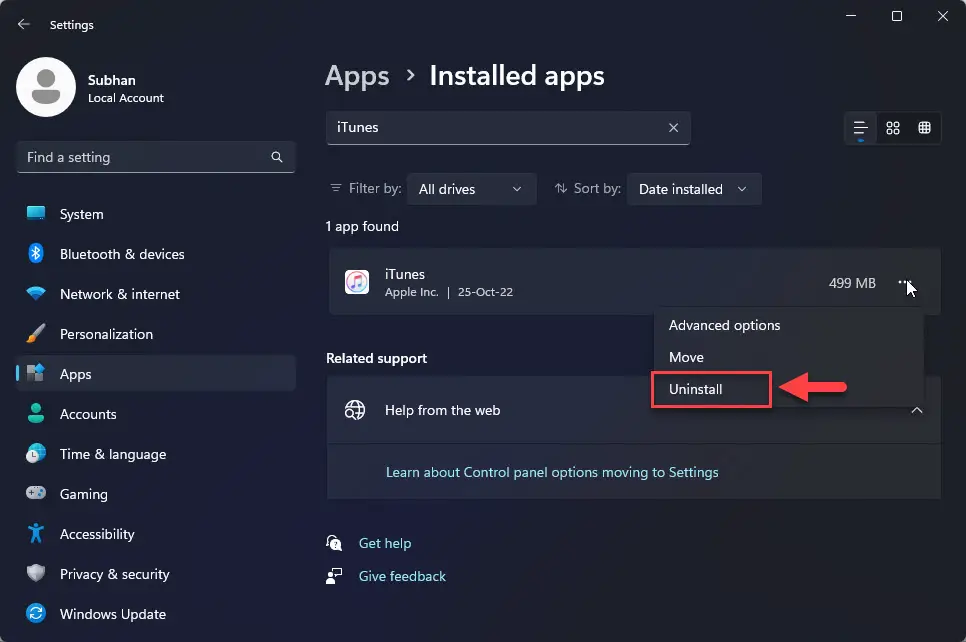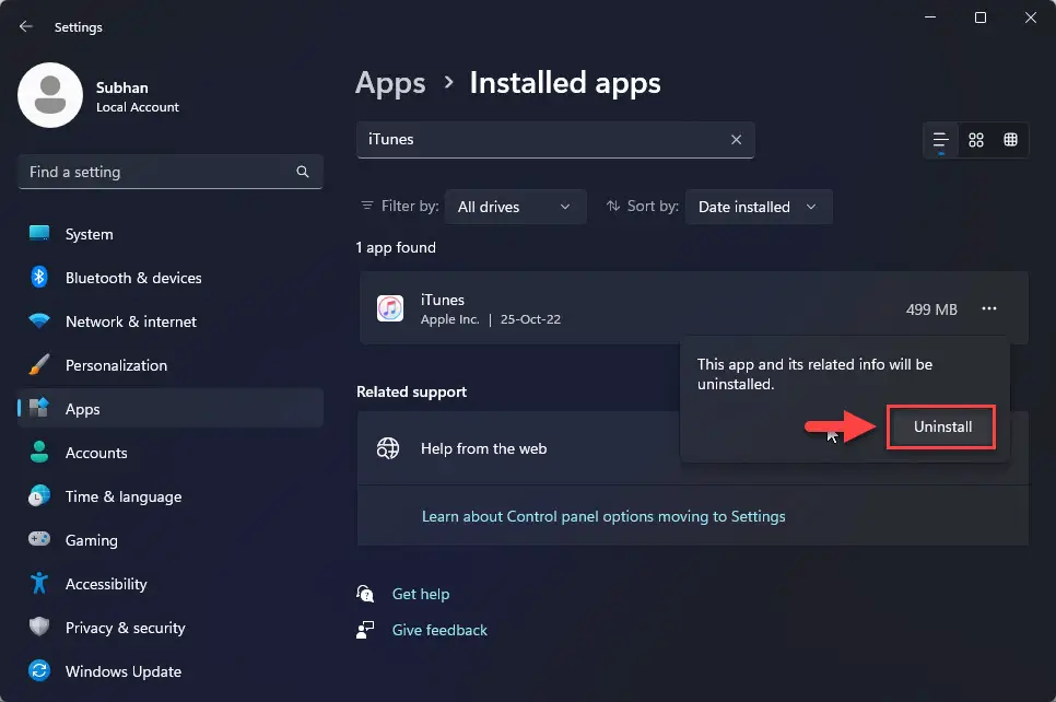 If you installed iTunes from Microsoft Store, then you may not see it in the Programs and Features applet. Thus, you must use the given method below to remove it from your PC: