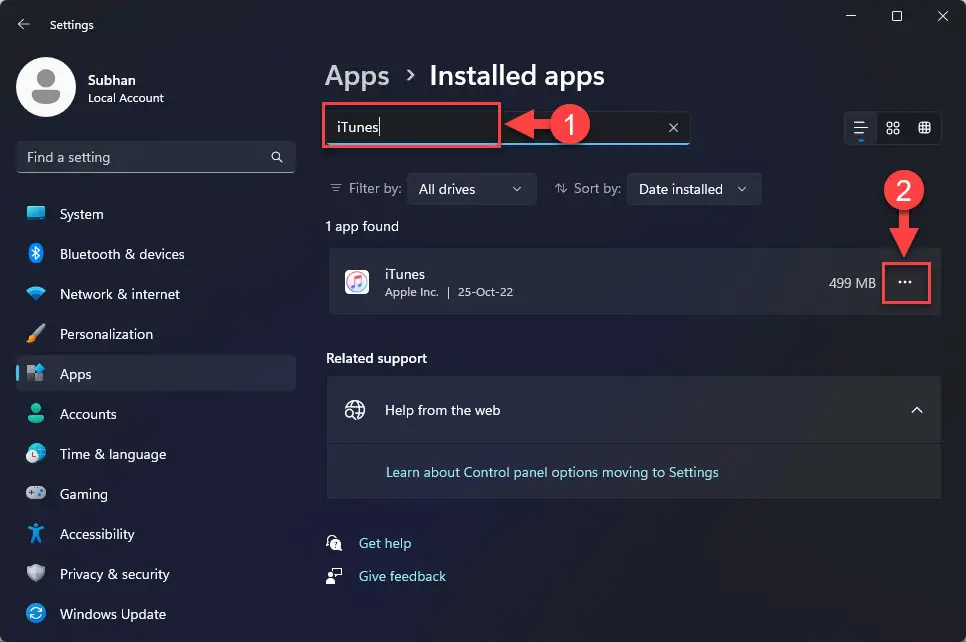 - Search for “iTunes” and then click on the ellipses (3 dots).