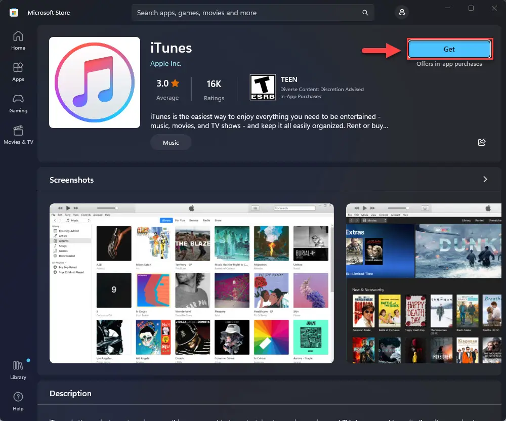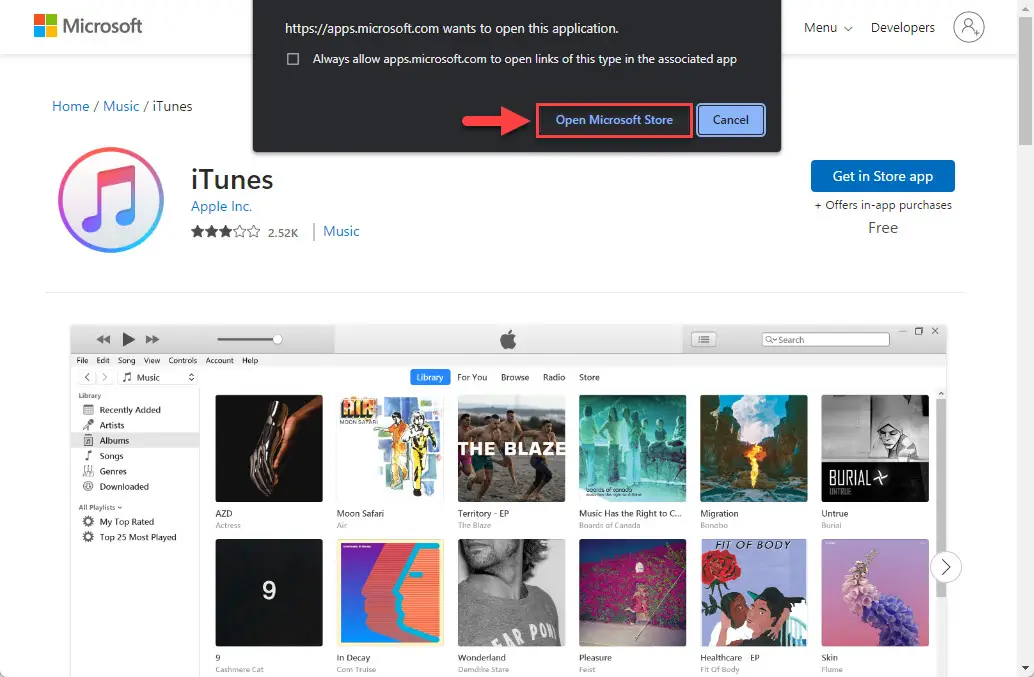 Microsoft Store will now open with the iTunes page in front of you. Click Get.
