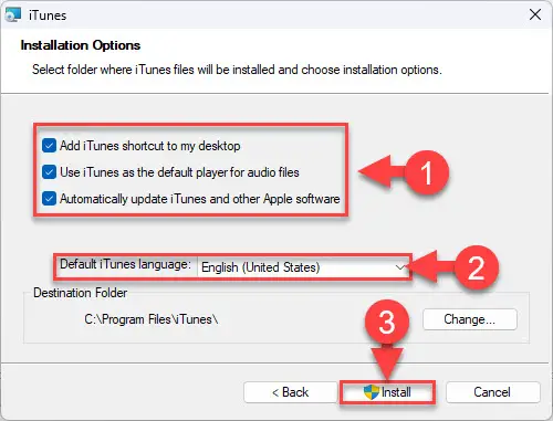 Select your installation preferences, choose a language for iTunes, and then click Install.