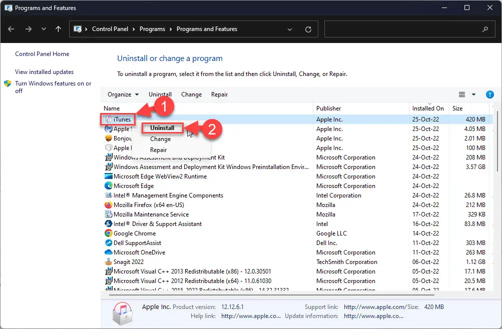 Right-click iTunes and then click Uninstall from the context menu. Alternatively, you can also double-click iTunes.