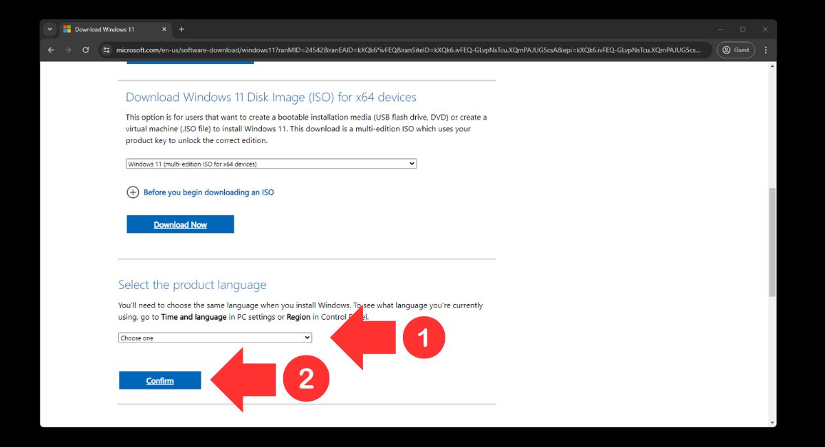 3.Next, select the language you wish to download Windows 11 from the drop-down menu and then click Confirm.