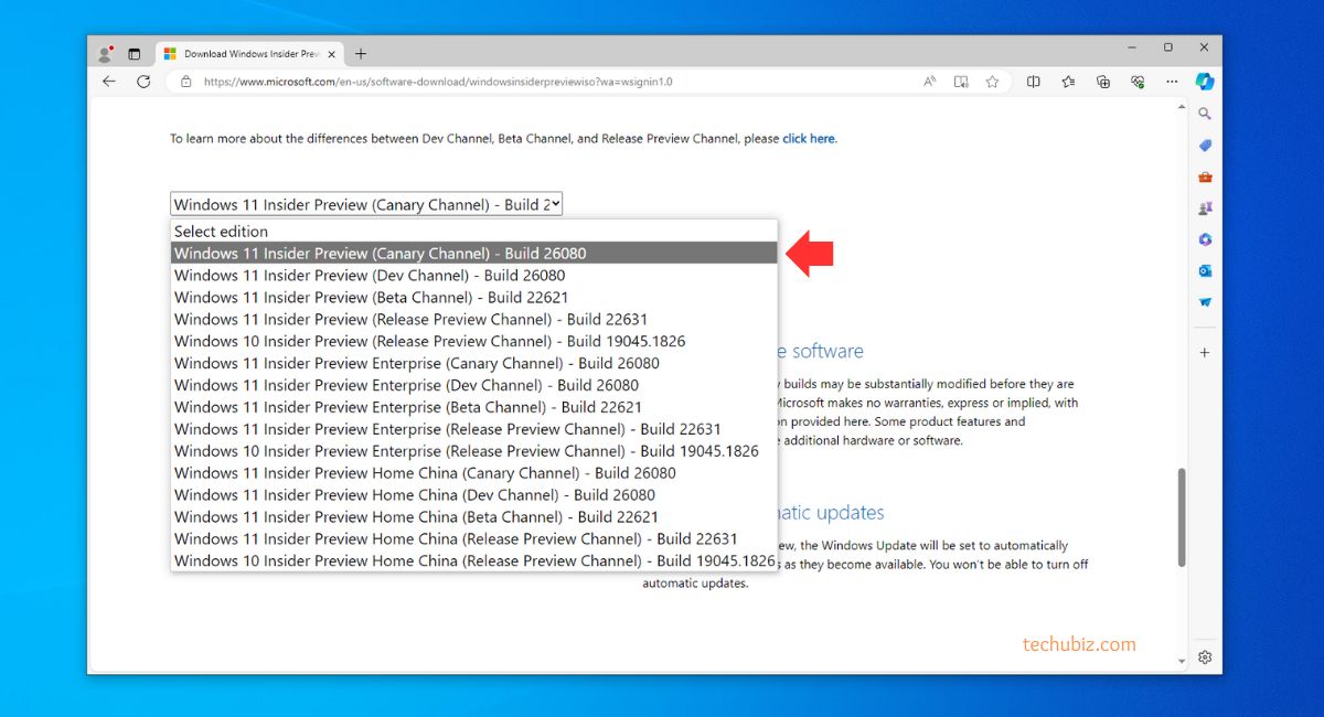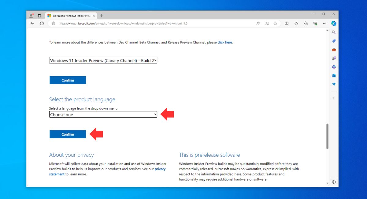 Scroll down and select a Windows Insider build from the drop-down menu and click Confirm.
