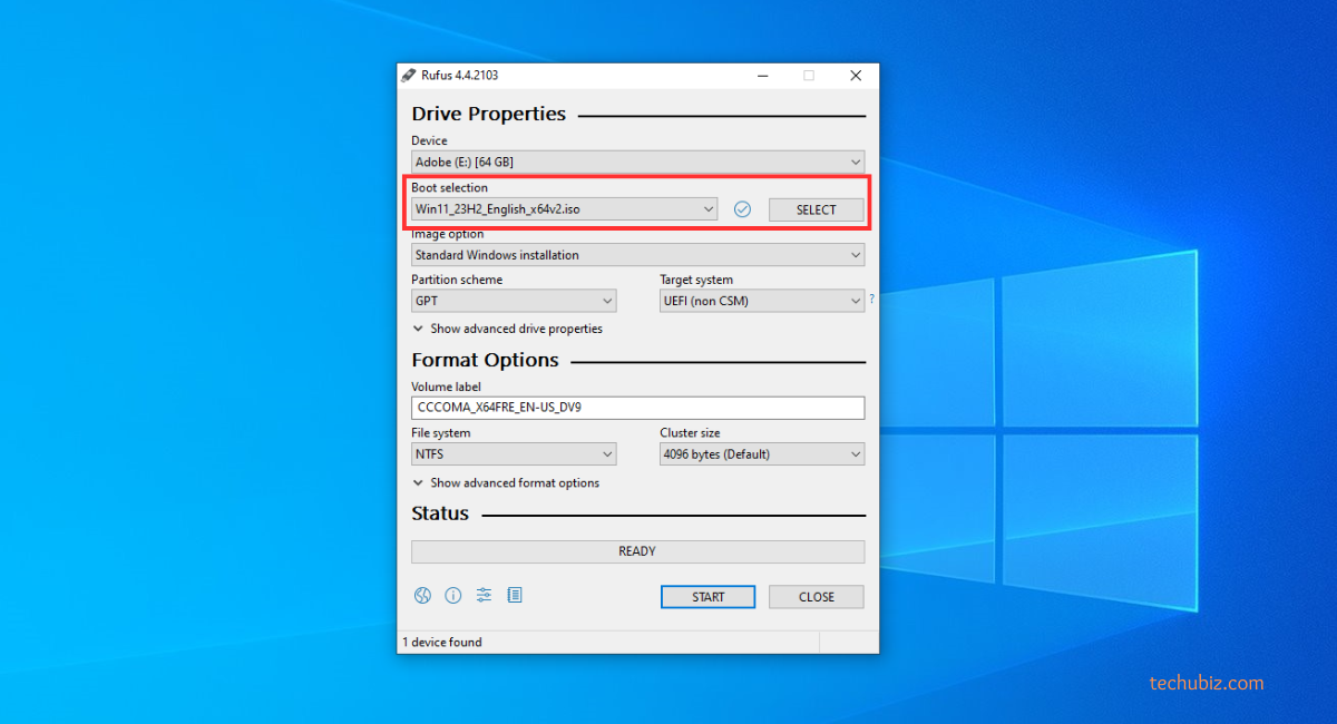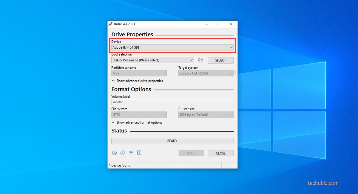 From Rufus, select the USB flash drive from the drop-down menu under Device.
