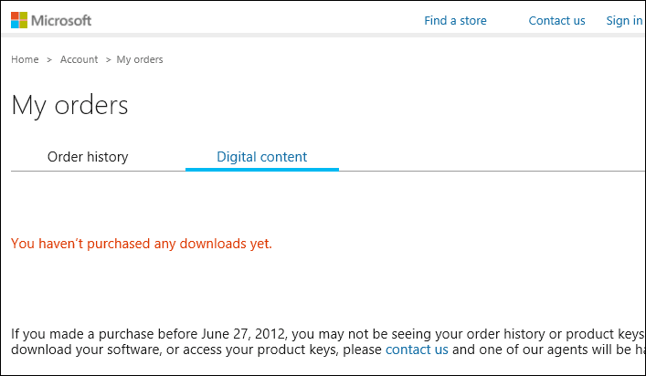 If you still donāt find it, log into theĀ Microsoft StoreĀ > Downloads > Product Keys > Subscription page. Click theĀ Digital ContentĀ tab to see your previous purchases along with your product key.