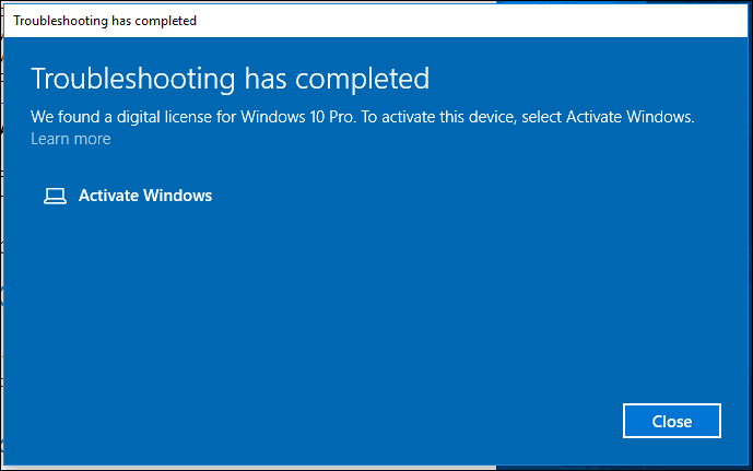 - After troubleshooting is completed, Windows 10 will indicate a digital license for Windows 10 Pro has been found.