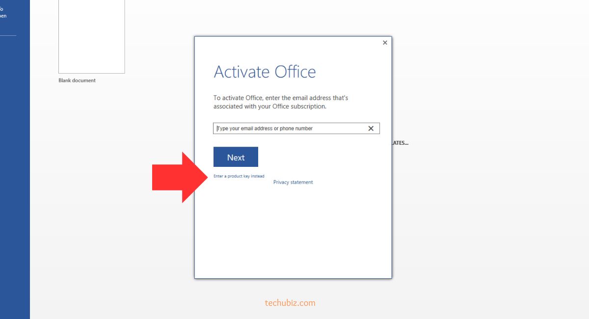 Open an Office app, e.g. Word or Excel. and click Enter product key instead